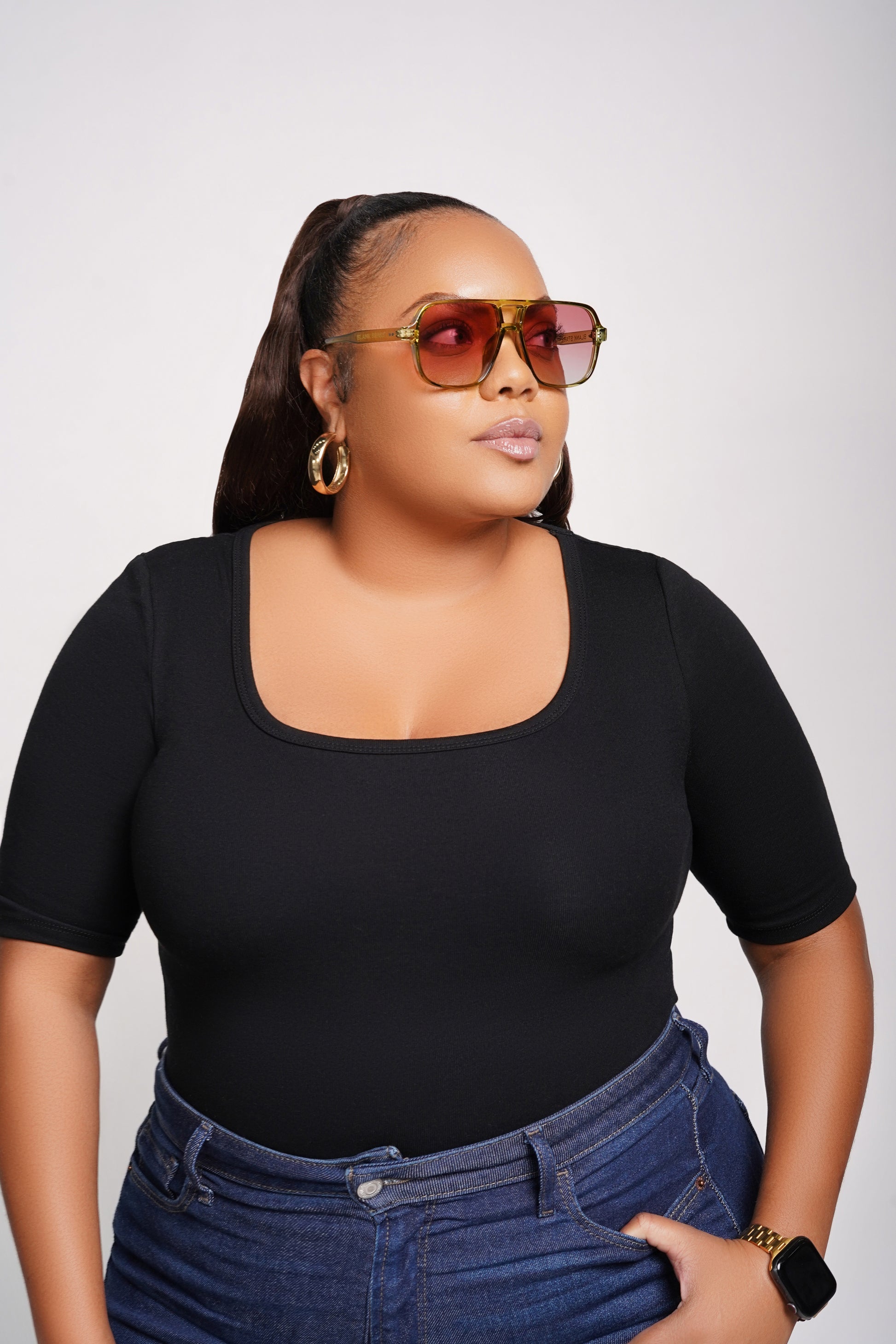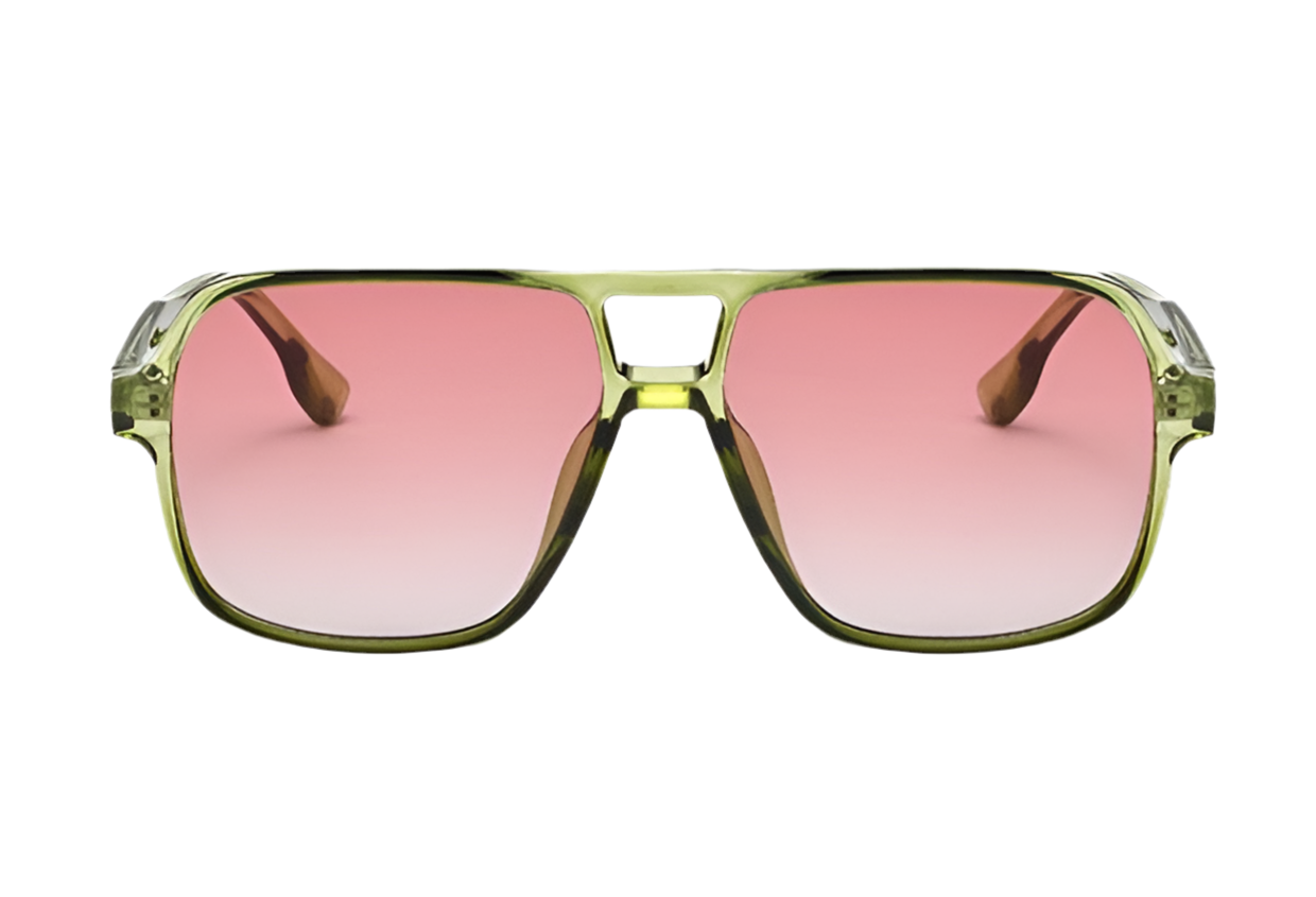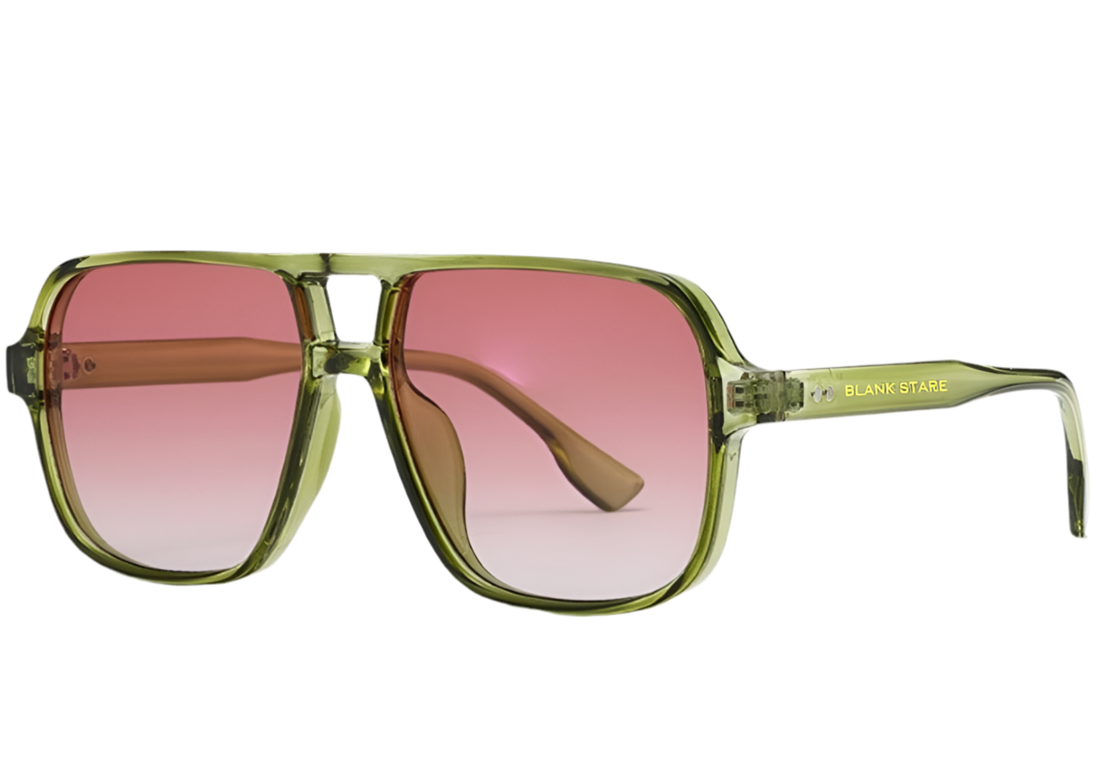 A bold aviator-style featuring olive green translucent frames with gold “BLANK STARE” detailing and striking pink gradient lenses. Perfect for a retro-chic look.
