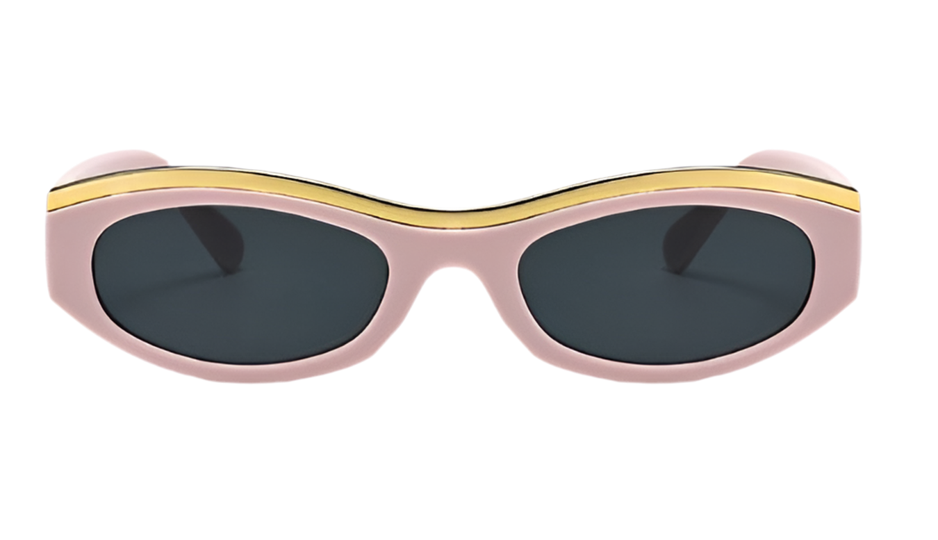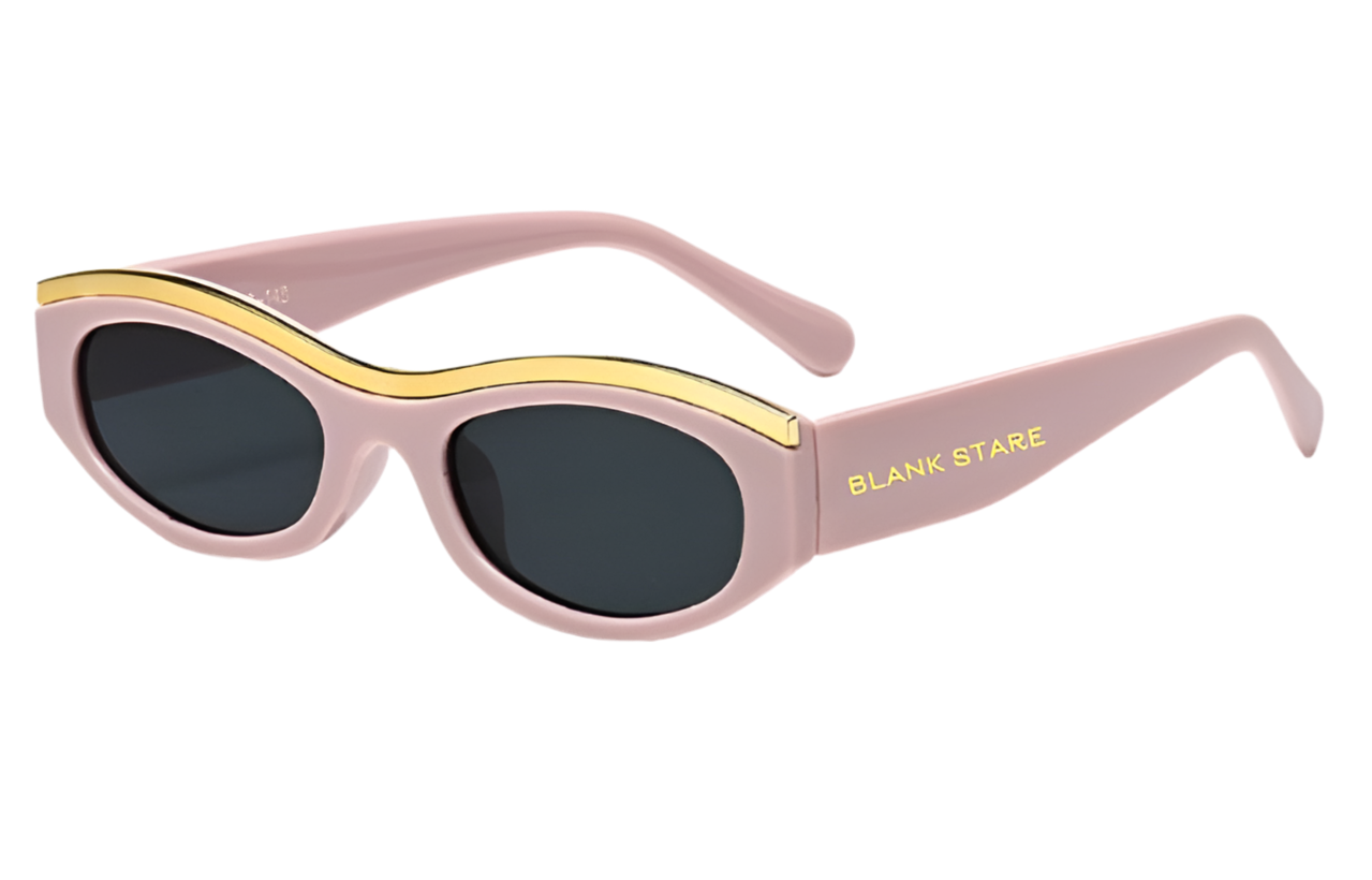 Soft pink frame with a sleek gold browline for a modern, elegant look. Black oval lenses and gold “BLANK STARE” branding add a touch of sophistication to this unique design.