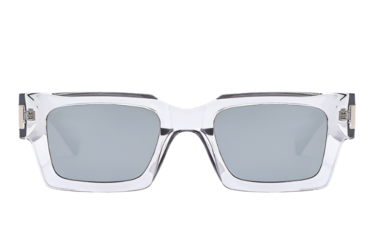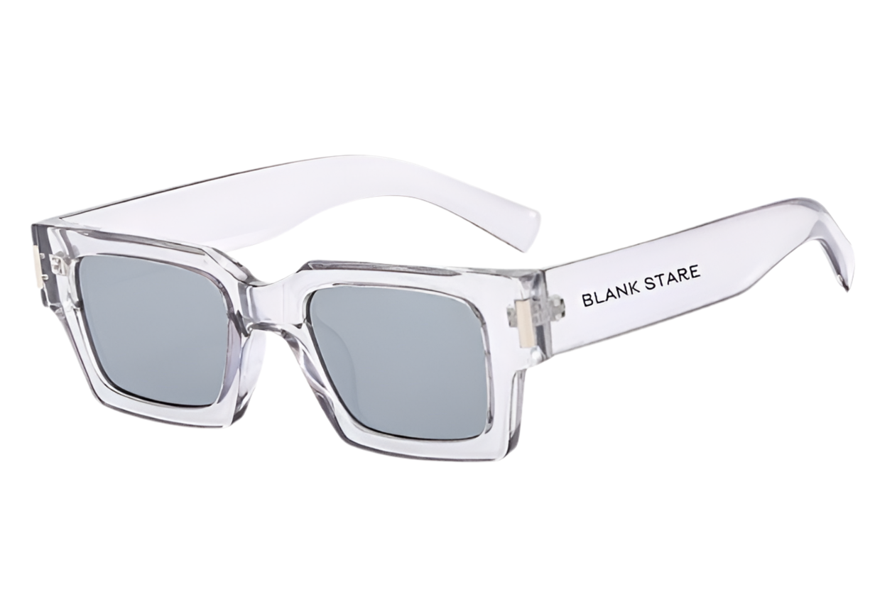 A modern, clear square frame with sleek silver-tone accents "BLANK STARE" detailing and matching tinted lenses. The minimalistic design gives it a sharp, clean aesthetic.